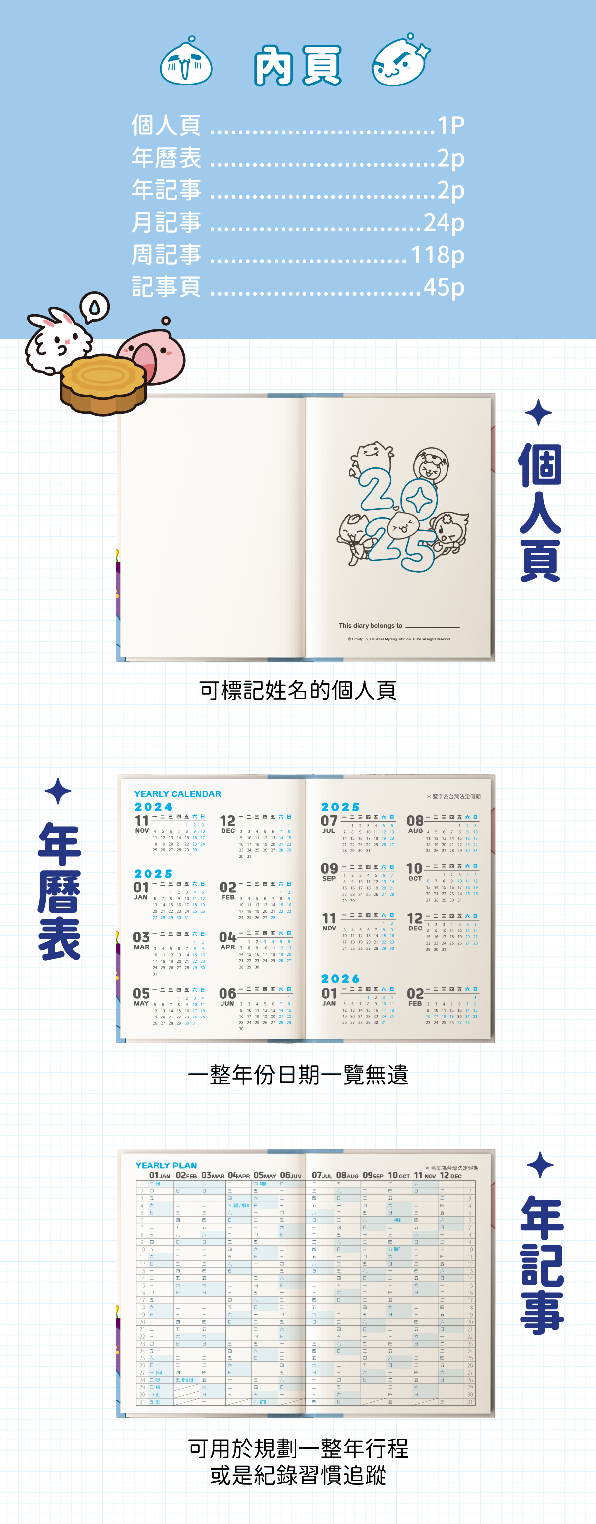 內頁包含了豐富的年曆表、年記事、月記事、週記事及筆記頁,